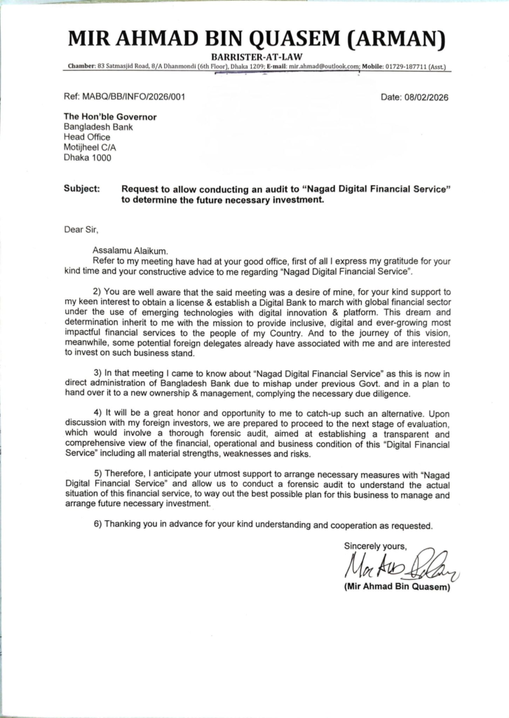 বাংলাদেশ জামায়াতে ইসলামীর নবনির্বাচিত সংসদ সদস্য মীর আহমাদ বিন কাসেম আরমান সমস্যায় থাকা মোবাইল ফাইন্যান্সিয়াল সার্ভিস প্রতিষ্ঠান নগদে নতুন বিনিয়োগ আনার উদ্যোগ নিয়েছেন। এ লক্ষ্যে সম্ভাব্য বিনিয়োগের আগে প্রতিষ্ঠানটির আর্থিক ও সার্বিক অবস্থা যাচাই করতে ফরেনসিক অডিটের অনুমতি চেয়ে বাংলাদেশ ব্যাংকের গভর্নরের কাছে চিঠি দিয়েছেন তিনি।