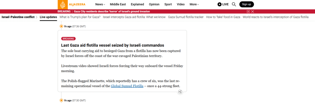 এর আগে ফ্লোটিলার মোট ৪৩টি নৌযান আটক করে দখলদার বাহিনী। প্রায় সব জাহাজ থেকে মানবাধিকারকর্মীদেরও গ্রেফতার করা হয়েছে। আটক হওয়া ব্যক্তিদের মধ্যে আছেন সুইডিশ জলবায়ু আন্দোলনকর্মী গ্রেটা থুনবার্গ। এ ঘটনায় আন্তর্জাতিক অঙ্গনে তীব্র প্রতিক্রিয়া দেখা দিয়েছে এবং অনেক দেশ ইসরাইলের এই পদক্ষেপকে ‘সন্ত্রাসী কর্মকাণ্ড’ আখ্যা দিয়ে নিন্দা জানিয়েছে।