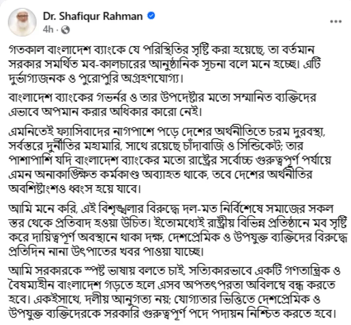 ফেসবুক পোস্টে ডা. শফিকুর রহমান বলেন, গতকাল বাংলাদেশ ব্যাংকে যে পরিস্থিতির সৃষ্টি করা হয়েছে, তা বর্তমান সরকার সমর্থিত মব কালচারের আনুষ্ঠানিক সূচনা বলে মনে হচ্ছে। এটি দুর্ভাগ্যজনক ও পুরোপুরি অগ্রহণযোগ্য। বাংলাদেশ ব্যাংকের গভর্নর ও তার উপদেষ্টার মতো সম্মানিত ব্যক্তিদের এভাবে অপমান করার অধিকার কারো নেই।