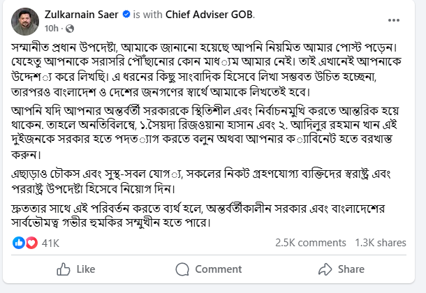 নিজের পোস্টে জুলকারনাইন সায়ের স্পষ্টভাবে পরিবেশবিদ সৈয়দা রিজওয়ানা হাসান এবং মানবাধিকার সংগঠক আদিলুর রহমান খানকে সরকারের উপদেষ্টা পদ থেকে বরখাস্ত করার আহ্বান জানান। তিনি মনে করেন, অন্তর্বর্তীকালীন সরকারকে স্থিতিশীল এবং নির্বিঘ্নে নির্বাচনমুখী করতে হলে এ সিদ্ধান্ত নেওয়া জরুরি। তার মতে, এ দুজন উপদেষ্টার উপস্থিতি সরকারকে দুর্বল করছে এবং জনআস্থার জন্য হুমকি হয়ে দাঁড়িয়েছে।