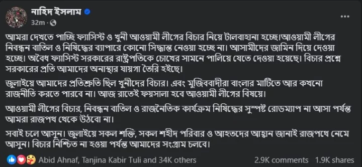 আওয়ামী লীগের বিচার, নিবন্ধন বাতিল ও রাজনৈতিক কার্যক্রম নিষিদ্ধের সুস্পষ্ট রোডম্যাপ না আসা পর্যন্ত আমরা রাজপথ থেকে উঠবো না বলেও হুঁশিয়ার করেন নাহিদ ইসলাম।