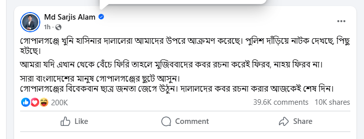 এই হামলা ও ভয়াবহ পরিস্থিতির মধ্যে থেকেই এনসিপির উত্তরাঞ্চলীয় মুখ্য সংগঠক সারজিস আলম ফেসবুকে এক জ্বালাময়ী পোস্টে লিখেছেন,