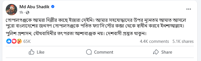“গোপালগঞ্জকে আমরা দিল্লীর কাছে ইজারা দেইনি। আমার সহযোদ্ধাদের উপর ন্যূনতম আঘাত আসলে পুরো বাংলাদেশের জনগণ গোপালগঞ্জকে পতিত ফ্যাসিস্টের কব্জা থেকে স্বাধীন করবে ইনশাআল্লাহ।”