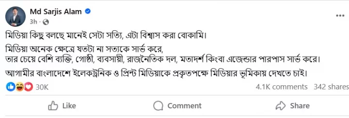 মিডিয়াকে বিশ্বাস করা বোকামি বলে মন্তব্য করেছেন জাতীয় নাগরিক পার্টির (এনসিপি) মুখ্য সংগঠক (উত্তরাঞ্চল) সারজিস আলম।