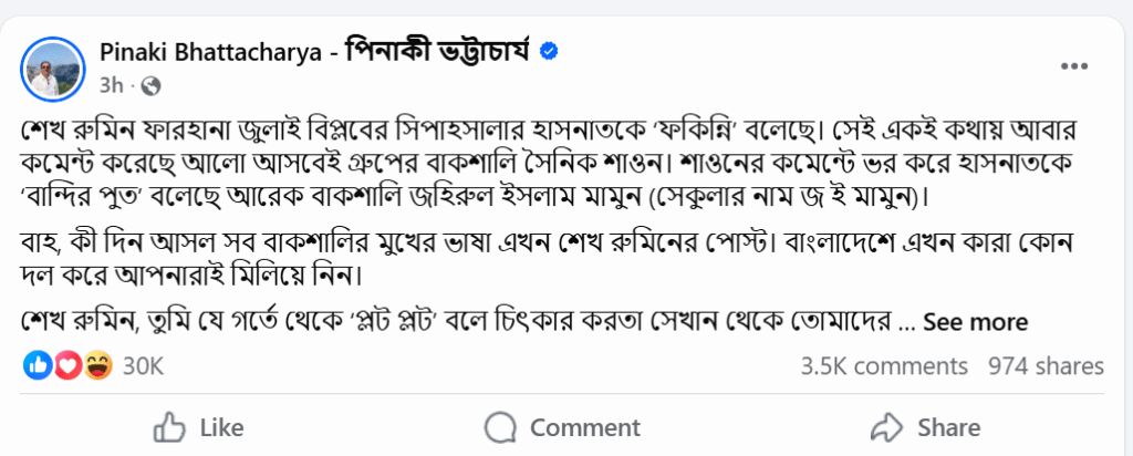 “শেখ রুমিন যেই গর্ত থেকে ‘প্লট প্লট’ বলে চিৎকার করত, সেই গর্ত থেকে রুমিনদের উদ্ধার করেছে হাসনাতরা। অথচ আজ সে বাকশালিদের ভাষা ধার করে বিপ্লবীদের আক্রমণ করছে।”