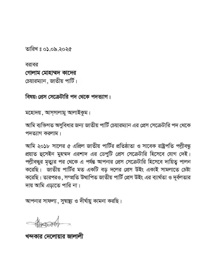 “আমি ২০১৮ সালের ৫ এপ্রিল জাতীয় পার্টির প্রতিষ্ঠাতা ও সাবেক রাষ্ট্রপতি পল্লীবন্ধু হুসেইন মুহম্মদ এরশাদের ডেপুটি প্রেস সেক্রেটারি হিসেবে যোগ দেই। পল্লীবন্ধুর মৃত্যুর পর থেকে এ পর্যন্ত আপনার প্রেস সেক্রেটারি হিসেবে দায়িত্ব পালন করেছি। জাতীয় পার্টির মতো একটি বড় দলের প্রেস উইং একাই সামলানোর চেষ্টা করেছি। তারপরও, সম্প্রতি উত্থাপিত জাতীয় পার্টির প্রেস উইংয়ের ব্যর্থতা ও দুর্বলতার দায় আমি এড়াতে পারি না।”