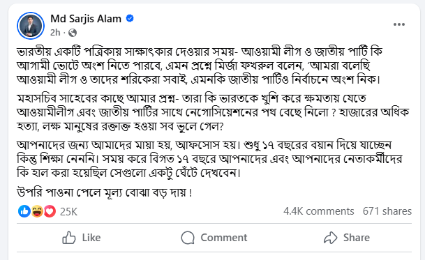 পোস্টে তিনি উল্লেখ করেন, ভারতীয় একটি পত্রিকায় সাক্ষাৎকার দেওয়ার সময় আওয়ামী লীগ ও জাতীয় পার্টি আগামী নির্বাচনে অংশ নিতে পারবে কিনা এমন প্রশ্নে বিএনপি মহাসচিব মির্জা ফখরুল ইসলাম আলমগীর বলেছেন, আওয়ামী লীগ, তাদের শরিক এমনকি জাতীয় পার্টিও যেন নির্বাচনে অংশ নেয়।