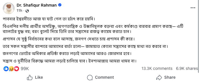স্ট্যাটাসে তিনি লেখেন, ইশ্বরদীতে ঘটে যাওয়া সহিংসতার পেছনে বিএনপির দলীয় প্রার্থীর ‘অসহিষ্ণু, অগণতান্ত্রিক ও উসকানিমূলক’ বক্তব্য ও কর্মকাণ্ড দায়ী। তার মতে, এসব আচরণ বারবারই প্রমাণ করছে—এটি কোনো ব্যালটের লড়াই নয়; বরং ‘বুলেট দিয়ে সন্ত্রাসের রাজত্ব কায়েমের চেষ্টা।’