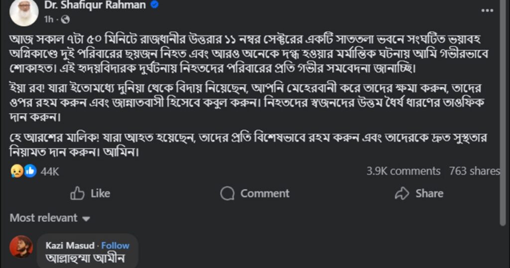 রাজধানীর উত্তরার ১১ নম্বর সেক্টরের একটি বহুতল ভবনে সংঘটিত ভয়াবহ অগ্নিকাণ্ডে গভীর শোক ও সমবেদনা জানিয়েছেন বাংলাদেশ জামায়াতে ইসলামীর আমির ডা. শফিকুর রহমান।